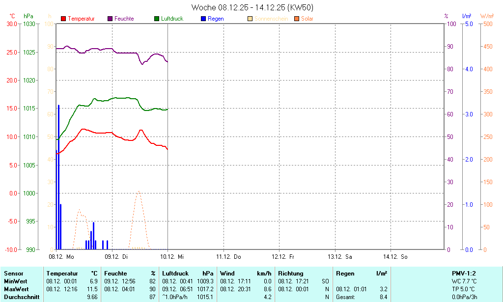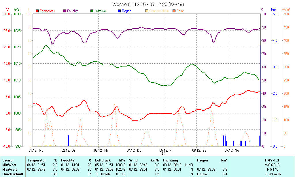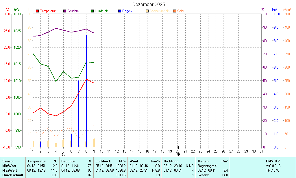 | Die dargestellten Werte repräsentieren die Daten der letzten 24 Stunden! Der Luftdruck ist auf Meereshöhe bezogen! |